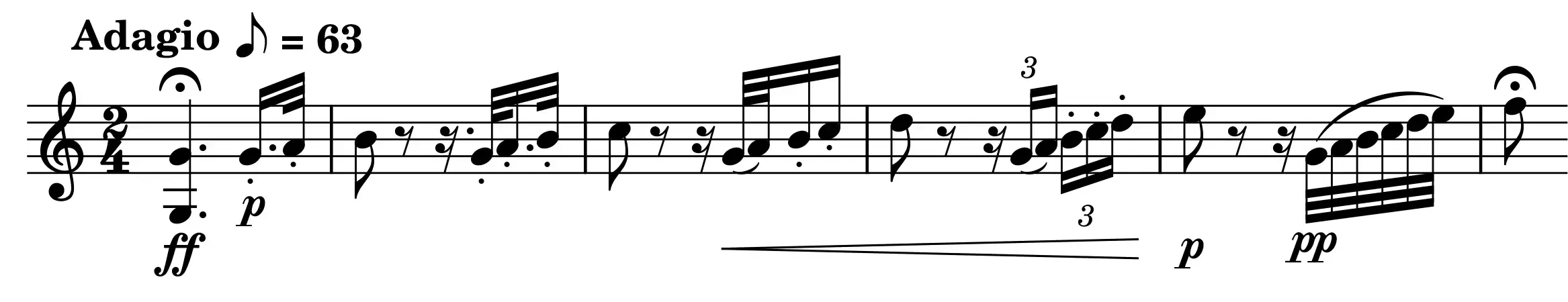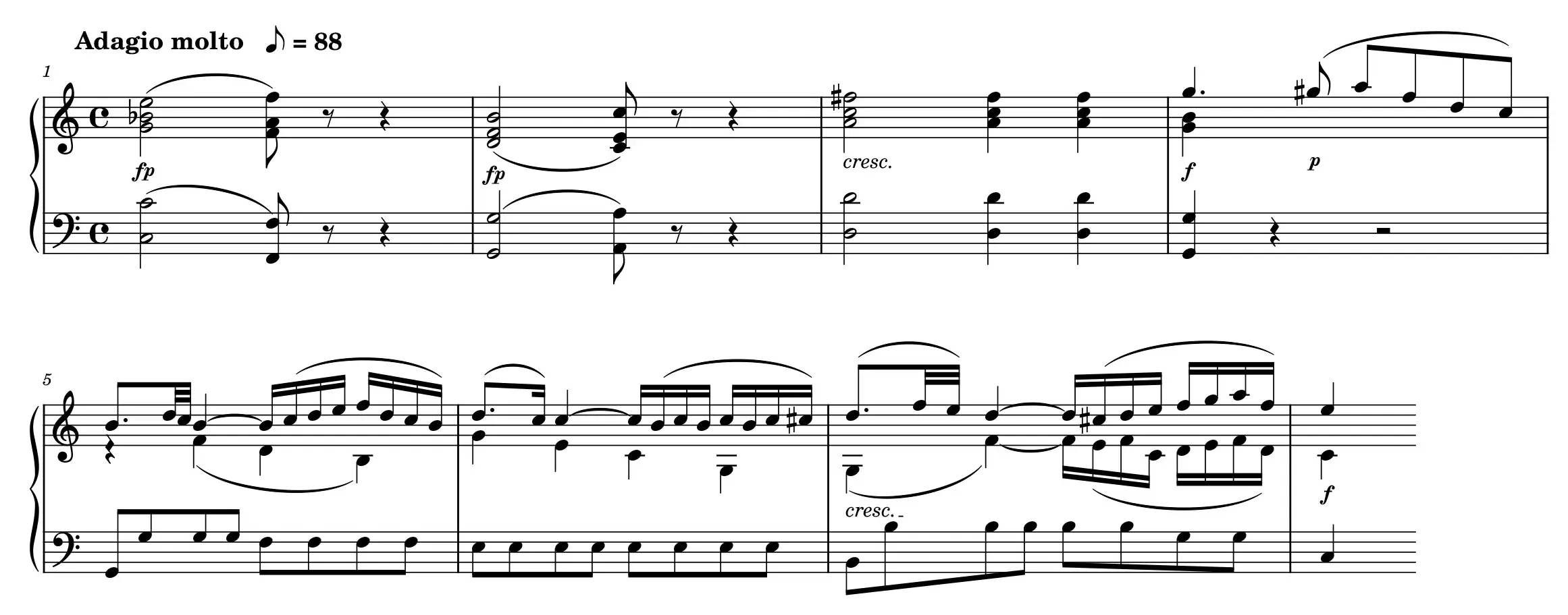 4つの楽章の中で最も軽やかな気分に満ちた終楽章であり、ハイドン的な諧謔を彷彿とさせる。曲の導入として配されている5小節からなるアダージョ(譜例3)は、まずソのユニゾンがフェルマータ付きで鳴らされる。このハ長調の第5音であるソを出発点として、第1ヴァイオリンがのちに出てくる終楽章の主題を探し求める。上方展開する音階動機によってファまで辿りついたのち、このファ音の持つ属七和音性の解決として、音階動機はそのままアレグロの第1主題に転じる。第1楽章と同様、大変秀逸な導入である。