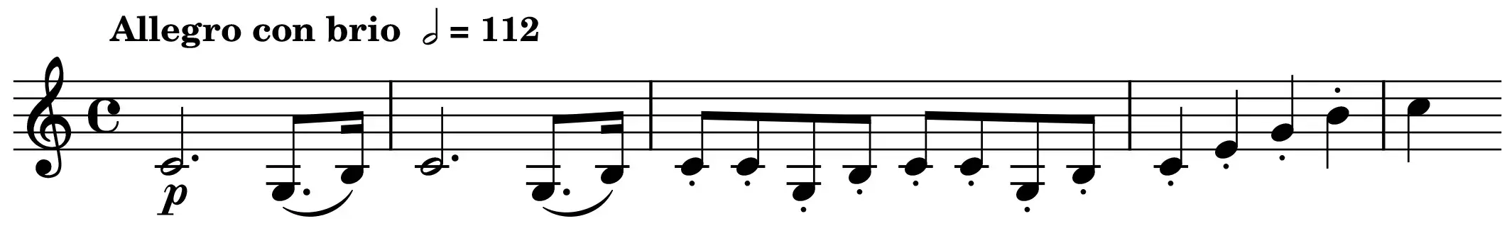 ハ長調の成立を強く感じさせるリズム動機である第1主題は、第1ヴァイオリンの主奏によって提示される(譜例2)。このリズム動機はイ長調に発する展開部において、ト短調、ニ短調などを経て、イ短調にて力強く応用される。再現部では、提示部とは異なりリズム動機が全奏にて再現され、主題の再来を効果的に強調している。曲はそのまま59小節にもわたるコーダへと突入し、それまで登場した動機を応用しながら楽章を締めくくる。