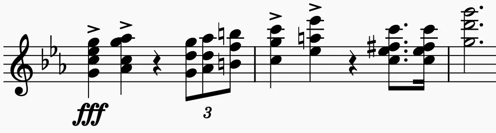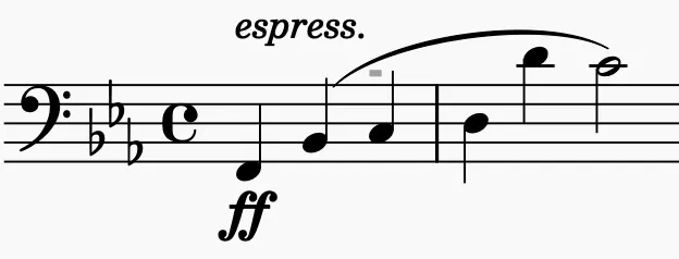 提示部第1主題では、譜例1の強奏で表現される残酷な死に対し、芸術家の生への執着(譜例2)が果敢に挑む。曲が盛り上がりを見せると、ロマン的な憧れを湛えた美しい「浄化の主題」の音型が現れ、物語の結末を予言する(譜例3)。