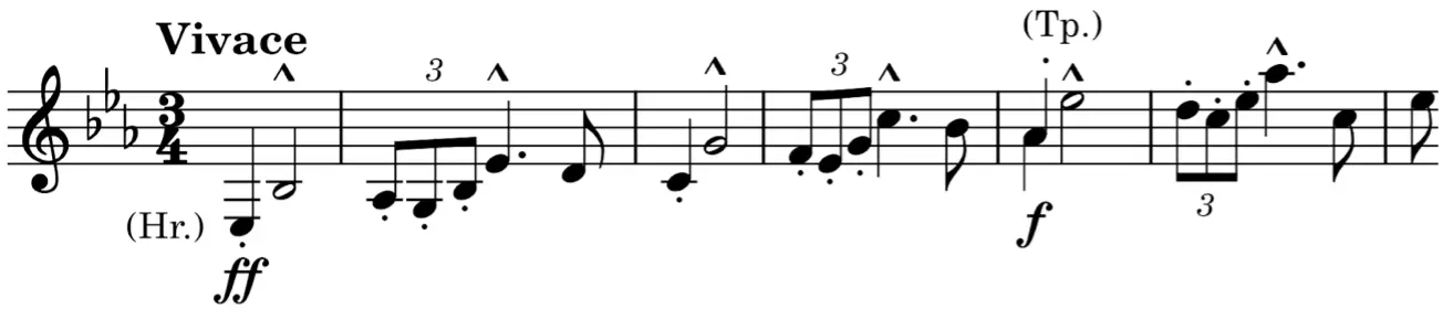 こうして、イタリアという「南国にて」、この生命力に満ちた序曲はするすると書き上げられた。英雄的な第1主題は、《エニグマ》第11変奏でも描かれる友人シンクレアの愛犬・ダンのエピソードに由来し、散歩中に川に落ちたダンが必死に這い上がり、無事に生還して嬉しそうに吠える場面を表す(譜例)。楽曲全体はソナタ形式のように書かれているものの、「展開部」に相当する部分では「ローマ人」と「カント・ポポラーレ(民謡)」という二つの新たな主題が導入される。また、エルガーの知覚したイタリアの様々な表情、ローマの栄枯盛衰が臨場感に溢れて描かれることからも、交響詩的性格が色濃い。