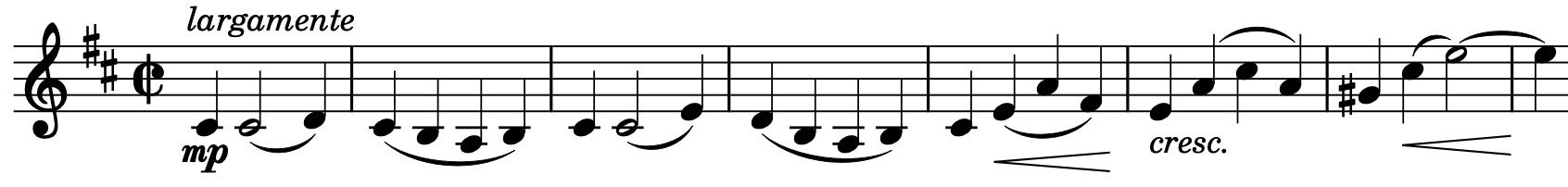 ニ長調、4分の3拍子。ソナタ形式である。冒頭の低弦による序奏(レ-ド♯-レ)は全曲を支配する基本動機を提示している。ホルンと木管楽器が伸びやかな第1主題を奏で、ヴァイオリンによる優美な旋律へと続く。やがて《交響曲第1番》にも見られるような重厚な強奏が訪れるが、暫くすると止み、チェロとヴィオラによる第2主題(譜例1)が始まる。第2主題の旋律は白眉と評されており、優しくも切なく、切なくも甘く、甘くも儚い。展開部への入りはやや分かりにくいが、ホルンによって呈示部の第1主題が奏でられ、さらに短調の要素が加わる。四散するD-Cis-Dの動機が、洗練された雰囲気をもたらす。その後再現部を経て、コーダではホルンのソロと弦楽器が豊かな旋律を響かせる。最後はピッツィカートがワルツのようなリズムを作りだしつつも、長くは続かず、曲は名残おしく閉じられる。